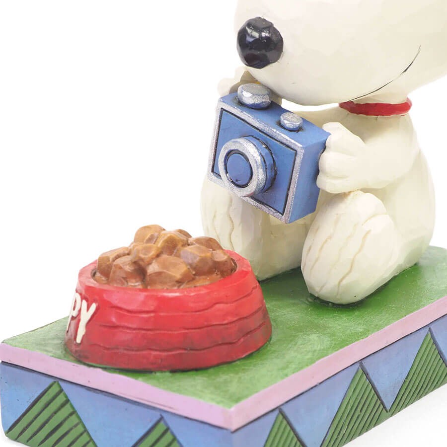 スヌーピーの次なる冒険を表現したフィギュアです。食いしんぼなスヌーピーは彼の大好物を最高のワンショットでカメラにおさめようとしています。