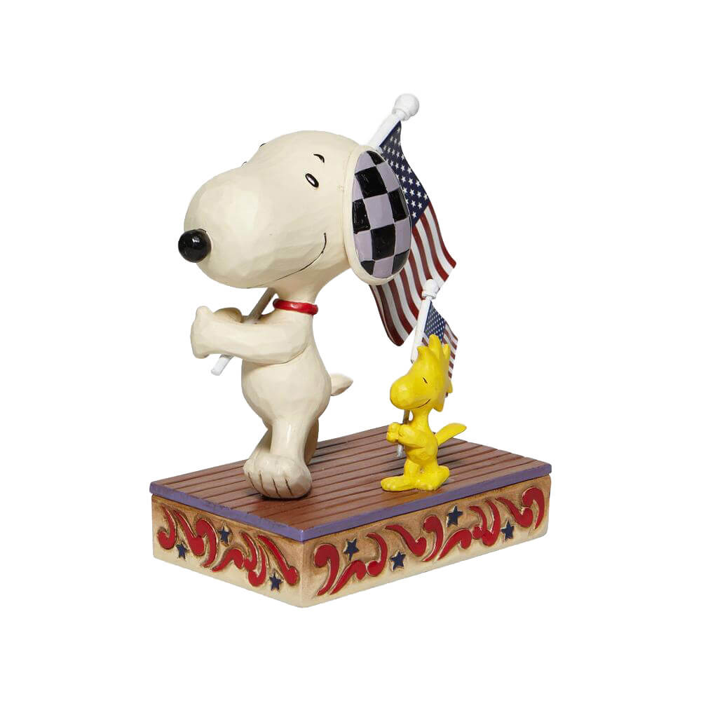 スヌーピーとウッドストックがアメリカ国旗を手に持ち誇らしげに行進しているデザインのフィギュアです。