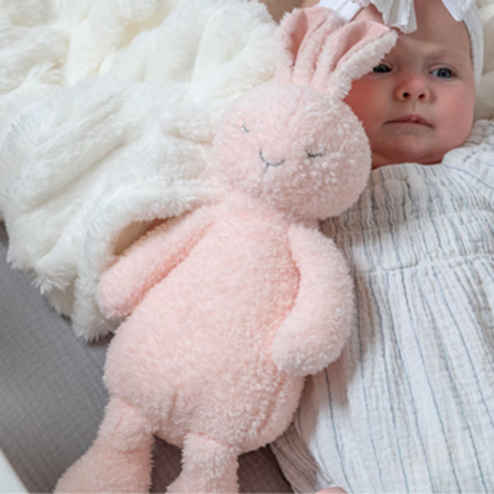 Mary Meyerから、ウサギのぬいぐるみが登場。 ふわふわのさわり心地と、足裏と耳にキラキラと光る生地がポイントです。 目をつぶっているので優しげな印象を与えてくれます。 ファーストトイやギフトにもおすすめです。